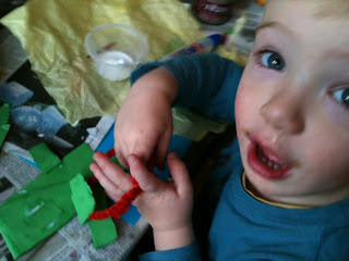 Ju made a 3D collage using green card paper he cut with his crinkly scissors and glue; he also made a pipe cleaner ornament for the tree, in the shape of an apple. Lilo mostly enjoyed climbing everywhere, watching my friend's goldfish swim and hugging giant teddy bears.